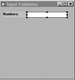 For the first keyboard filtering example, you will build an input control that only accepts numerals zero through nine. First, add a label control and a text box control to the form. Set the caption property of the label control to Numbers. Set the Name property of the text box control to txtNumber and set the text property to blank. Your form should resemble the one in Figure 6.1.