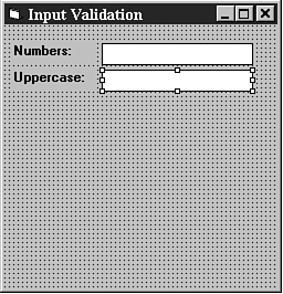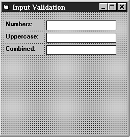 For the rest of this section, you'll be building a sample application that illustrates the various input validation methods we will cover. If you haven't done so already, start up Visual Basic 4 and create a new project. Set the caption of the form to Input Validation, save the form as INPVAL.FRM, and save the project as INPVAL.VBP.