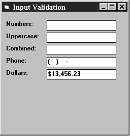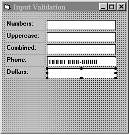 The Visual Basic 4 MaskedEdit control offers an extensive set of input masking tools. It ships with several input masks predefined, including dollar amounts, US phone numbers, and several date and time formats. To view these formats, select the MaskedEdit control, click the right (alternate) mouse button, and select Properties from the menu that appears. You will find the formats on the General tab.