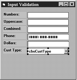 First add another label and a drop-down combo control to the form. Set the label caption to CustType and set the drop-down combo box Name property to cboCustType and the Style property to 2DropDown List. Your form should look like the one in Figure 6.7.