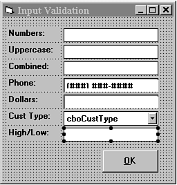 To set up the form level validation, first add a single command button to the form. Set its Name property to cmdOK and its caption property to &OK. Now add another label/text box pair to the form. Set the label caption to High/Low. Set the text box Name property to txtHighLow and the text property to blank. Refer to Figure 6.8 for sizing and placement.