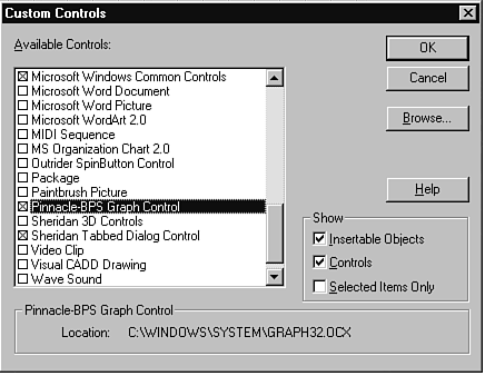 Before you can start using the graph control tool, you have to make sure it is loaded into the Visual Basic toolbox. To do this, load Visual Basic and select Tools | Custom Controls from the Visual Basic main menu. In the list of available controls, locate Pinnacle-BPS Graph Control (see Figure 12.1). Click the checkbox to add the control to your toolbox and then click the OK button to exit the form.