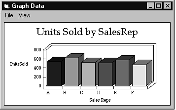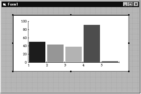 Add the graph control to a blank form by double-clicking the graph control icon in the toolbox. You'll see that the graph control automatically displays a two-dimensional bar graph with some data. Now stretch the control so that your form looks like the one shown in Figure 12.2.