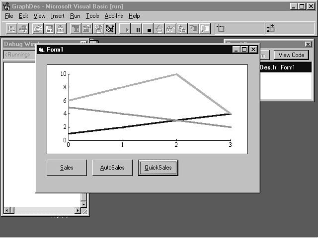 Save and run the project. When you press the AutoSales button, you'll see the same graph that was generated with the Sales button. Notice that, in this example, you left out the lines of code that set the ThisSet and the ThisPoint properties. These values were handled by the graph control using the AutoInc property. This might not seem like a code savings, but it really is. Single set data is relatively easy to graph. Multiple sets get pretty confusing. It's much easier to use the AutoInc property because it automatically updates the ThisSet property, too. There is yet another way to add data to a graph control: using the QuickData property.
