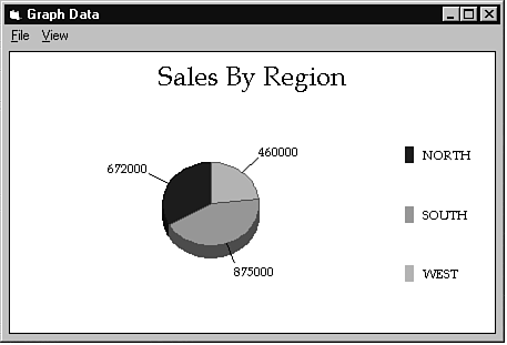 Notice that you used the SQL statement you defined earlier to create the snapshot object. The rest of the code should be familiar by now: You set several variables that are required for the database and/or the graph library. Next, you opened the database and created a snapshot data object using the SQL statement, and then you called the graph routine. Now, save and run the project. When you select Graph | Sales by Region from the main menu, you should see a graph like the one shown in Figure 12.11.