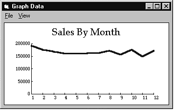 In Listing 12.1, you do a few things. First, you clear out any data that might already be stored in the graph control. Next, you set the GraphType property to show a three-dimensional bar graph. Also, you set the NumSets and NumPoints properties to 1 and 12, respectively, and then add the data points. Notice that the graph control must be told which set you want filled (using the ThisSet property). Next, you go through a loopfirst, setting the ThisPoint property and then adding the data item. Finally, you set the DrawMode property to gphDraw to force Visual Basic to redraw the graph with the new data.