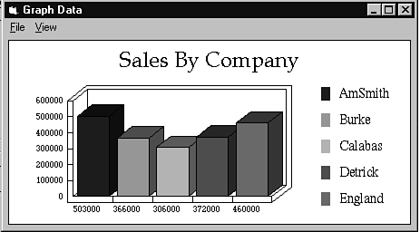 Again, the only real differences are in the SQL statement and the titles, labels, and legends. Save and run the project. Your Sales by Company graph should look like the one in Figure 12.13.