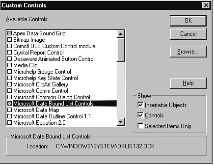Let's start a new project and illustrate the data-bound list control. Once you start the new project, you must make sure you have added the data-bound list controls to your project. Select Tools | Custom Controls item from the Visual Basic 4 main menu. Locate and select the Microsoft Data-Bound List Controls item. Your screen should look like the one in Figure 13.1.