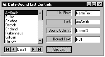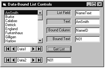 Notice that we added the array references to the code to account for the new control arrays. Now save and run the project. When you select an item from the list and click the GetList button, you'll see the BoundColumn and BoundText properties displayed in the appropriate text boxes, as shown in Figure 13.5.