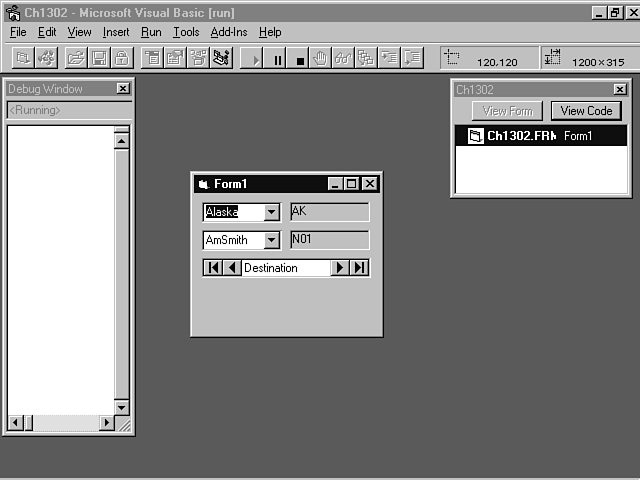 You can make selections in either of the two combo boxes and see that the label controls get updated automatically. Also, you can move through the data set using the data control arrow buttons and watch the two combo boxes automatically update as each record changes.
