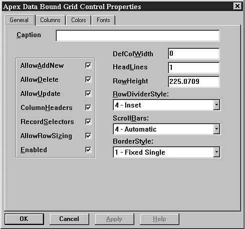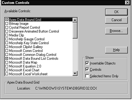 It's really quite easy to create a data-bound grid form. First, start a new Visual Basic 4 project. Next, make sure you add the data-bound grid tool to your list of custom controls. To do this, select Tools | Custom Controls from the Visual Basic 4 main menu. Locate and select the Apex Data-Bound Grid Control. Your screen should resemble Figure 13.9.