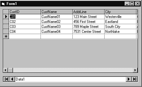 You can move through the grid by clicking on the left margin of the grid control. You can also move through the grid by clicking on the navigation arrows of the data control. If you select a cell in the grid, you can edit that cell. As soon as you leave the row, that cell is updated by Visual Basic 4. Right now, you cannot add or delete records from the grid. You'll add those features in the next example.
