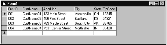 To add a record to the data grid, all you need to do is place the cursor at the first field in the empty row at the bottom of the grid and start typing. Visual Basic 4 creates a new line for you and allows you to enter data. Take note how the record pointer turns into a pencil as you type. Use Figure 13.12 as a guide. When you leave the line, Visual Basic 4 saves the record to the data set.