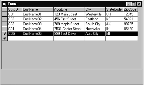 Now save and run the project. Select an entire record by clicking on the left margin of the grid. This highlights all the columns in the row. (See Figure 13.15 Figure 13.15