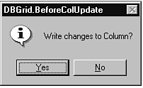 Add some code in the BeforeColUpdate event to force the user to confirm the update of a column. Open the DBGrid.BeforeColUpdate event and enter the code in Listing 13.4.