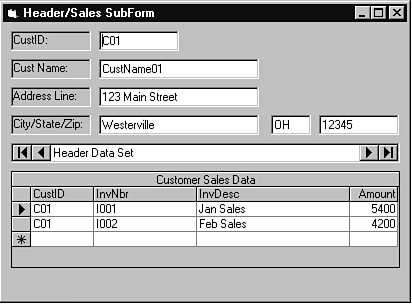 Typically, Subforms are used to display data tables linked via relationship definitions. In the case just mentioned, the customer information is probably in a single master table, and the invoice data is probably in a related list table that is linked via the customer ID or some other unique field. When you have these types of relationships, Subforms make an excellent way to present data.