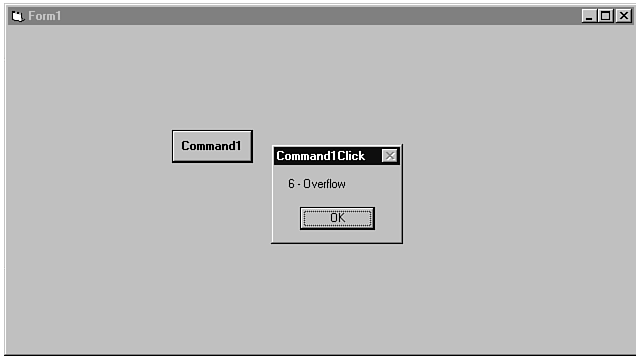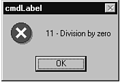 Save the form as ERROR01.FRM, and save the project as ERROR01.VBP. Then execute the program and click on the command button. You'll see the error message displayed on the screen (see Figure 14.1).