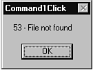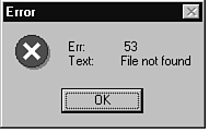 When you click the OK button in the message box, you'll see another error message. This one reports an Error 53 File not Found message, which occurred when NewSub tried to open the nonexistent file (see Figure 14.3).