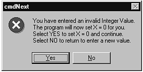 Save and run this project. When you press the Next command button and enter an invalid value (that is, any number greater than 32,767), you'll see the error message that explains your options (see Figure 14.7).