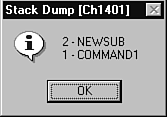 Now save and run the project. When you click on the Command1 button, you'll see the usual error messages and a new message box that shows the modules that are currently running. Running this routine brings out a very handy aspect of the stack routine. Look carefully at the second stack message box (see Figure 14.17).
