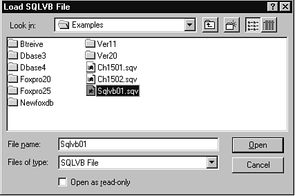 The opening screen is actually a multidocument interface. You can load and run one or more scripts from this interface. To test the system, load and run a simple test script. Using SQL-VB, select File | Run, and at the File | Open dialog, locate and select SQLVB01.SQV (refer to Figure 15.2).