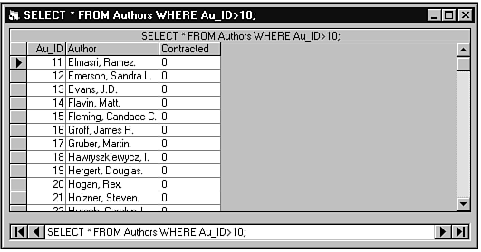 Let's change the SQL script so that the first result set includes only authors whose Au_ID is greater than 10. To do this, add the text WHERE Au_ID>10; to the first SELECT statement. Be sure to place the semicolon (;) at the end of the line. SQL-VB needs this character to indicate the end of an SQL statement. Also, let's comment out the rest of the view sets for now. You only want to see one result set in this test. To do this, add two slashes (//) to the start of all the other lines that contain SELECT statements. Be sure to place a space after the // comment sign. Your script should now resemble Listing 15.1.