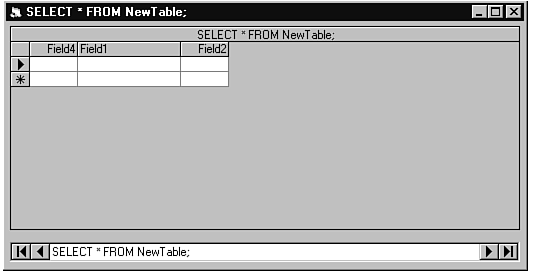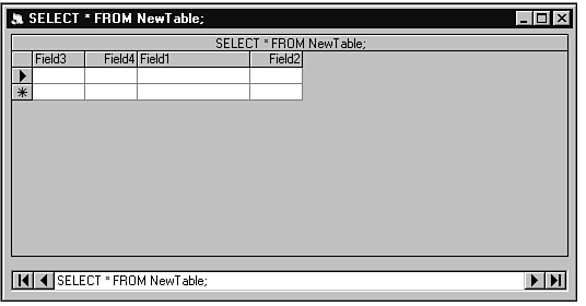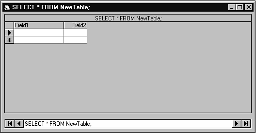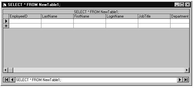 This script creates a new database, creates a new table in the database, and displays the empty table in a result set. Use SQL-VB to run the script by selecting File | Run and locating and loading the SQLVB02.SQV script file. Your results should appear as shown in Figure 15.7.