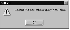 Save and run the updated SQLVB02.SQV. You should see an SQL error message telling you that it could not find the table NewTable. This happened because the script executed the DROP TABLE statement just before the SELECT...FROM statement. The error message appears in Figure 15.10.