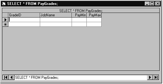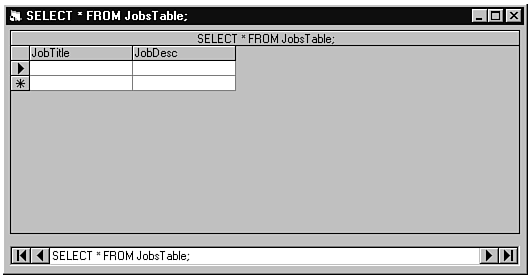 You can set up foreign key relations between any two columns in any two tables. They need not have the same column name, but they must have the same data type. For example, you can add a table to the SQLVB04.MDB database that holds information about job titles and pay grades. But in this table the column that holds the job title will be called JobName. Enter the script in Listing 15.14, save it, and execute it. Refer to Figure 15.16 as a guide.