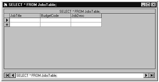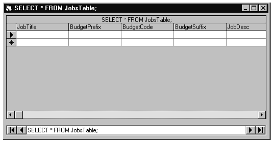 The SQL script in Listing 15.10 shows a new column in the JobsTable data table that was created in the last SQL-VBscript. The new column, BudgetCode, is defined as an optional column data column that must contain unique data. Update your version of the SQLVB04.SQV script, save it, and execute it. Your result set should resemble the one shown in Figure 15.13.