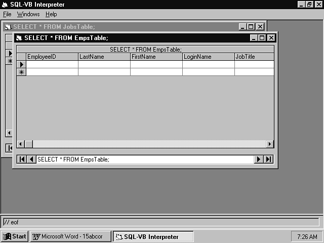 Use the SQL-VB editor window to load SQLVB04.SQV. Modify the script to match the code in Listing 15.13, save it, and run the script. Your screen should resemble Figure 15.15.