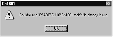 Now run the executable file. It will load and display the data control. Run a second instance of the executable. This is an attempt to run a copy of the same program. Because this second copy will attempt to open the same database for exclusive use, you'll see an error message when the second program starts. (See Figure 18.1.)