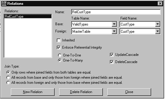 Whenever you have defined a relation object where the base table is a master table and the foreign table is a child table (that is, CustomerMaster.CustID is the base table and CustomerComments.CustID is the foreign table), you might want to define both an update and a delete cascade. It is logical to make sure that any changes to the CustomerMaster.CustID field would be updated in the CustomerComments.CustID field. It might also make sense to delete all CustomerComments records whenever the related CustomerMaster record is deleted. However, this is not always the case. For example, if the child table is CustomerInvoice, you might not want to automatically delete all invoices on file. Instead, you might want Microsoft JET to prevent the deletion of the CustomerMaster record if a related CustomerInvoice record exists.