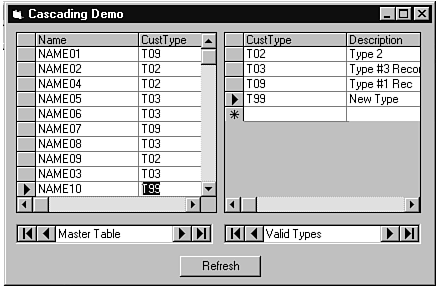 When you run the project, you'll see the two tables displayed in each grid, side-by-side. First, test the update cascade by editing one of the records in the Valid Types table. Select the first record and change the CustType column value from T01 to T09. When you have finished the edit and have moved the record pointer to another record in the ValidTypes grid, press the Refresh button to update both data sets. You'll see that all records in the MasterTable that had a value of T01 in their CustType field now have a value of T09. The update of ValidTypes was "cascaded" into the MasterTable by Microsoft JET.
