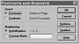 The Footnote/Endnote dialog box, used for entering a custom footnote mark for a context string.