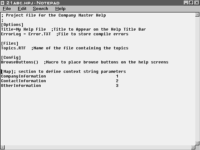 The final section you we'll include in the exercise is the [Map] section. In this section, you enter numeric references to the context strings that you entered into the RTF file. Be very careful when building this section. Your context strings must be identical to the context strings entered in the RTF file. Enter the followig: