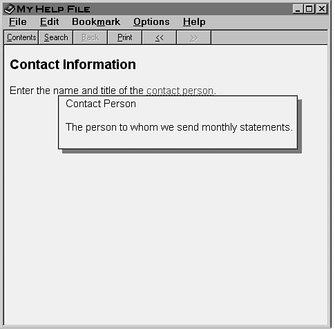 Let's turn to the design of your help application. As demonstrated in the exercises for this chapter, your help topic file will contain the information that users will depend upon to operate your application. An effective help system must be designed properly to meet the users' needs.
