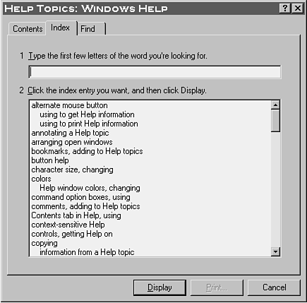 You can find help topics in the Help Topics dialog box by typing a keyword for a topic and then clicking the Display button. Determining which keywords apply to a specific topic is the focus of the next lesson.