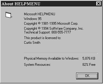 Save your form and your project. Run the project and select each of the menu items. Notice that Help | Contents displays the Contents page of the help file you created earlier today and declared in the Form_Load event. Selecting Help | Search displays a listing of topics from the same help file. The menu selection Help | Help on Help displays a screen similar to Figure 21.12 which shows the Win 95 help topics. Selecting Help | About displays a dialog similar to Figure 21.13 which contains information about your program. Finally, selecting Exit from the File menu stops the execution of the program.