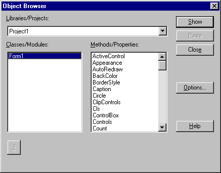 Imagine that you create a project (Project1) with one form (Form1). On the form, you place a text box. Now open the Object Browser and select Project1 from the Libraries/Projects combo box. The Classes/Modules section contains one item: Form1. The