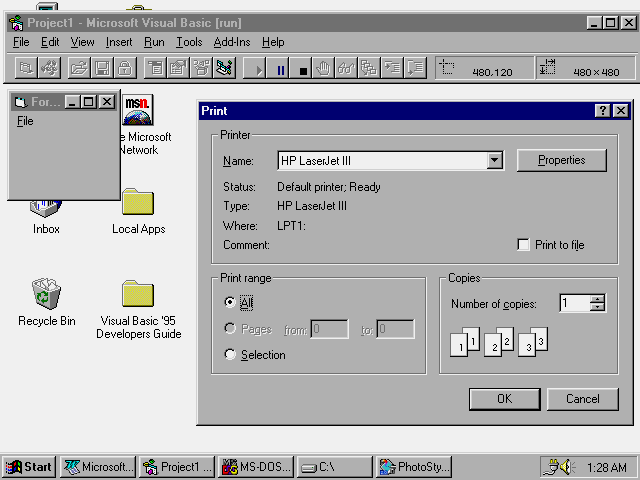 In the following example, the Print dialog box appears on-screen when the user clicks the File | Print menu option. The steps to create the example follow: