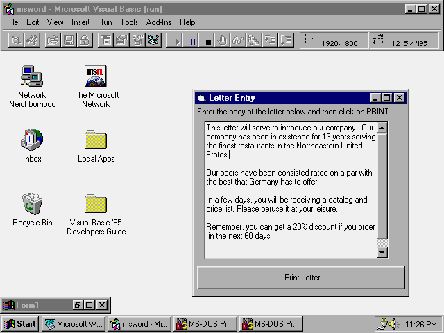 clicks a command button, and Microsoft Word starts. The information from the user is combined with the Letter2 template to produce a printed page.