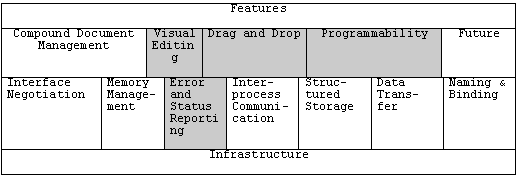 OLE 2.x is a complex technology that has been notoriously difficult for developers to implement. It is constructed on a layered model as shown in Figure 16.1. The upper layer describes the features available for use by (or customization for) the end