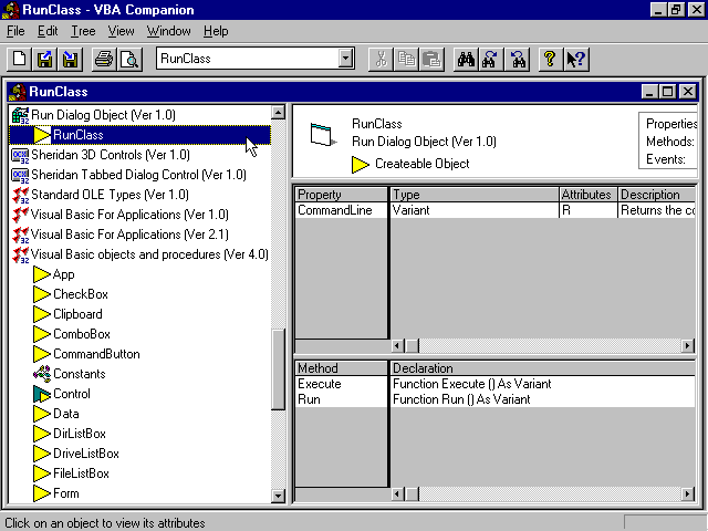 This does not launch the application but registers it with the system and exposes its type library. Figure 16.11 shows the type library for the rbRun.DLL exposed in VBA Companion.
