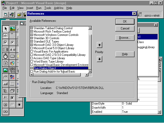 In order to transform your simple Run dialog into an add-in to Visual Basic, you need to open a new project in Visual Basic and set a reference in the Tools References dialog box to the rbRun Run Dialog object (see Figure 16.12).