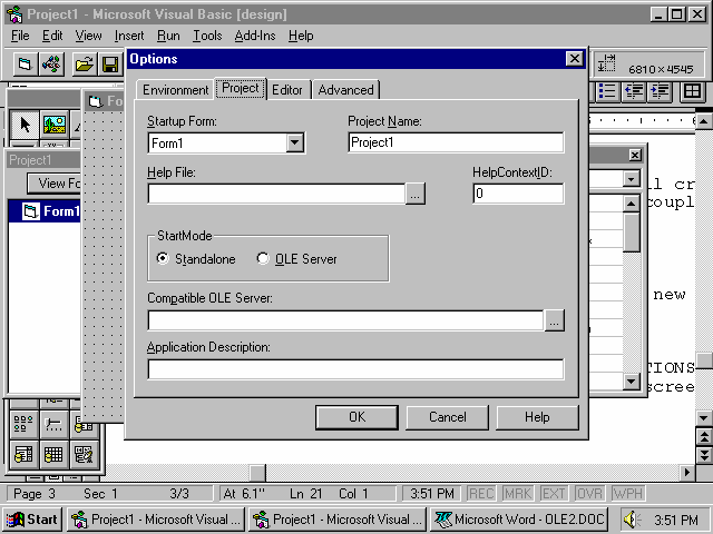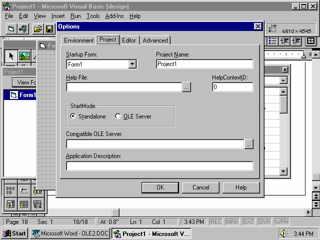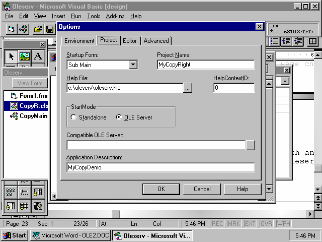 In the Start Mode box, make sure you select the OLE server option in order to create your server first. Visual Basic creates temporary entries into the system registry and creates links to any client provided that you execute two copies of Visual Basic