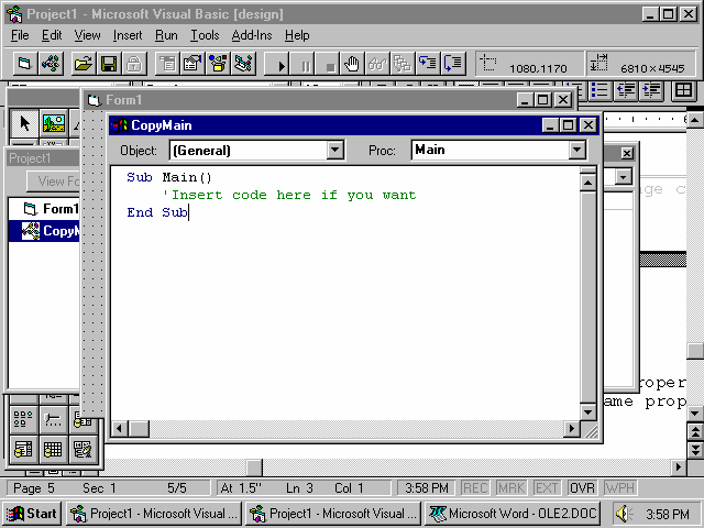 The Sub Main procedure you chose in step 4 above is where you can establish start-up code prior to initialization if you need or want to do so. To make this procedure work, you first need to create a code module. Follow these steps: