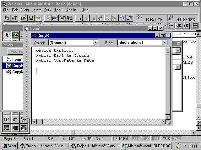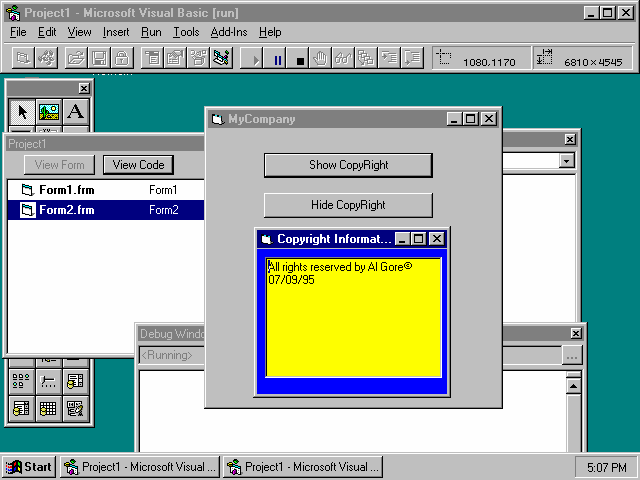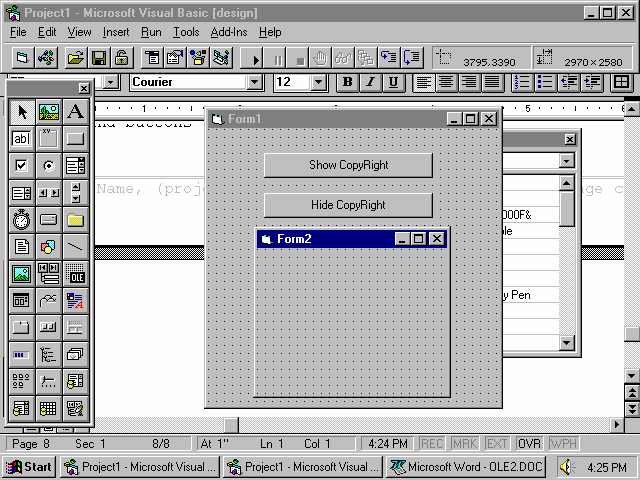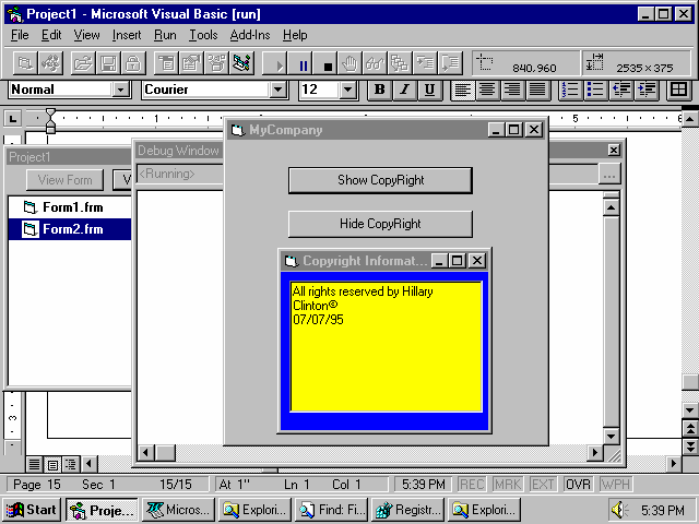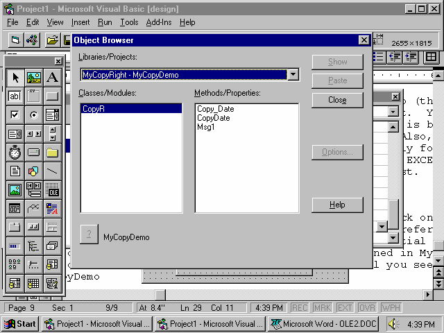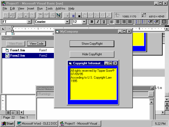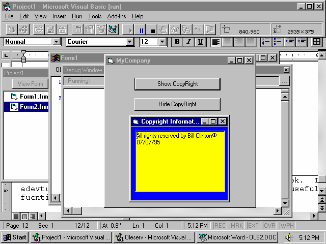 application again and click on the Show Copyright button (now without the other instance of Visual Basic running), you see the screen shown in Figure 19.12. Save this OLE server project and client project as separate projects.