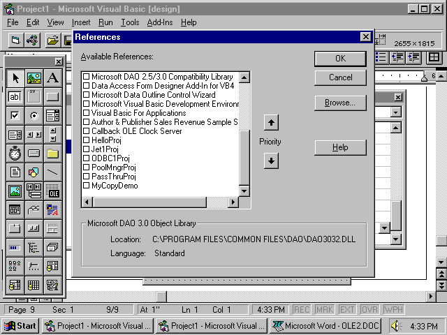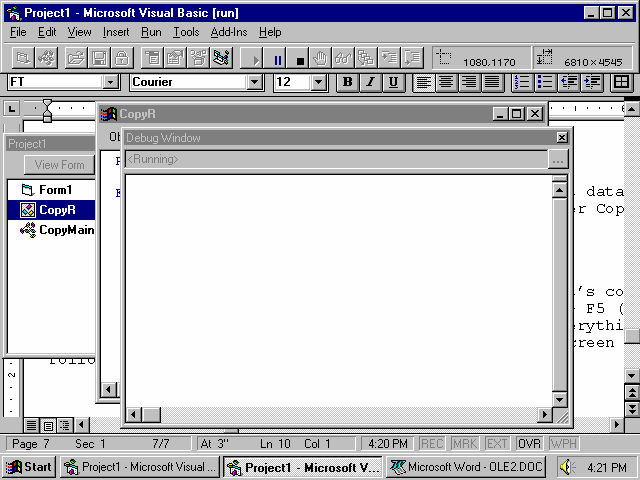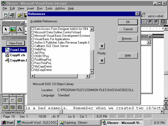 instance of Visual Basic that is running your OLE server. Then go into your client application and remove the reference to MyCopyDemo (you called your DLL COPYR.DLL). Using the Browse button, point to COPYR.DLL in the C:\OLESERV directory. When you run the