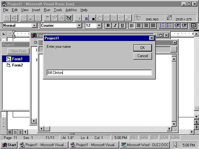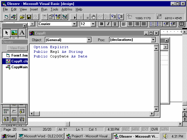 in Design mode, the first copy being your OLE server and the second copy being your client, and perform the proper setting with the Reference function. Although you may not yet want to compile this application of your server and link it into the registry,